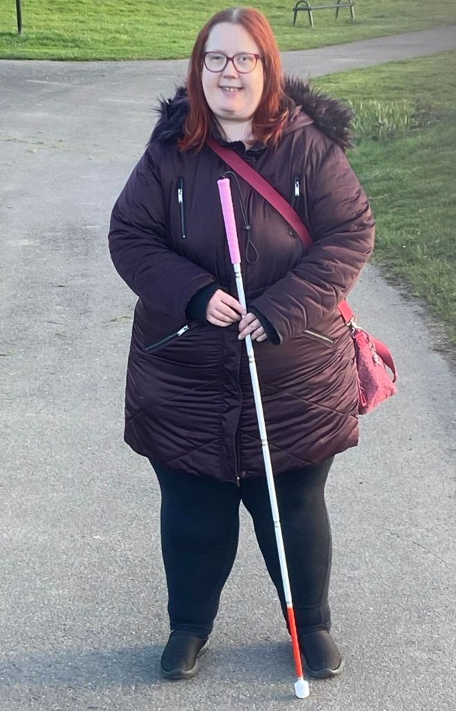 A long cane is ĺonger and is supposed to be tall enough to reach the chest when it is stood up straight. It is used by sweeping it across the ground. This helps to judge uneven ground and different types of paving. It also helps me to identify obstacles and trip hazards. I think this could help me to feel more confident again. I have ordered one with a pink handle and I can’t wait for it to come. There is also a light up ball available for the end of it. This lights up red and blue. This is to help me and my stick get seen in the dark. I think I might get one of those.
